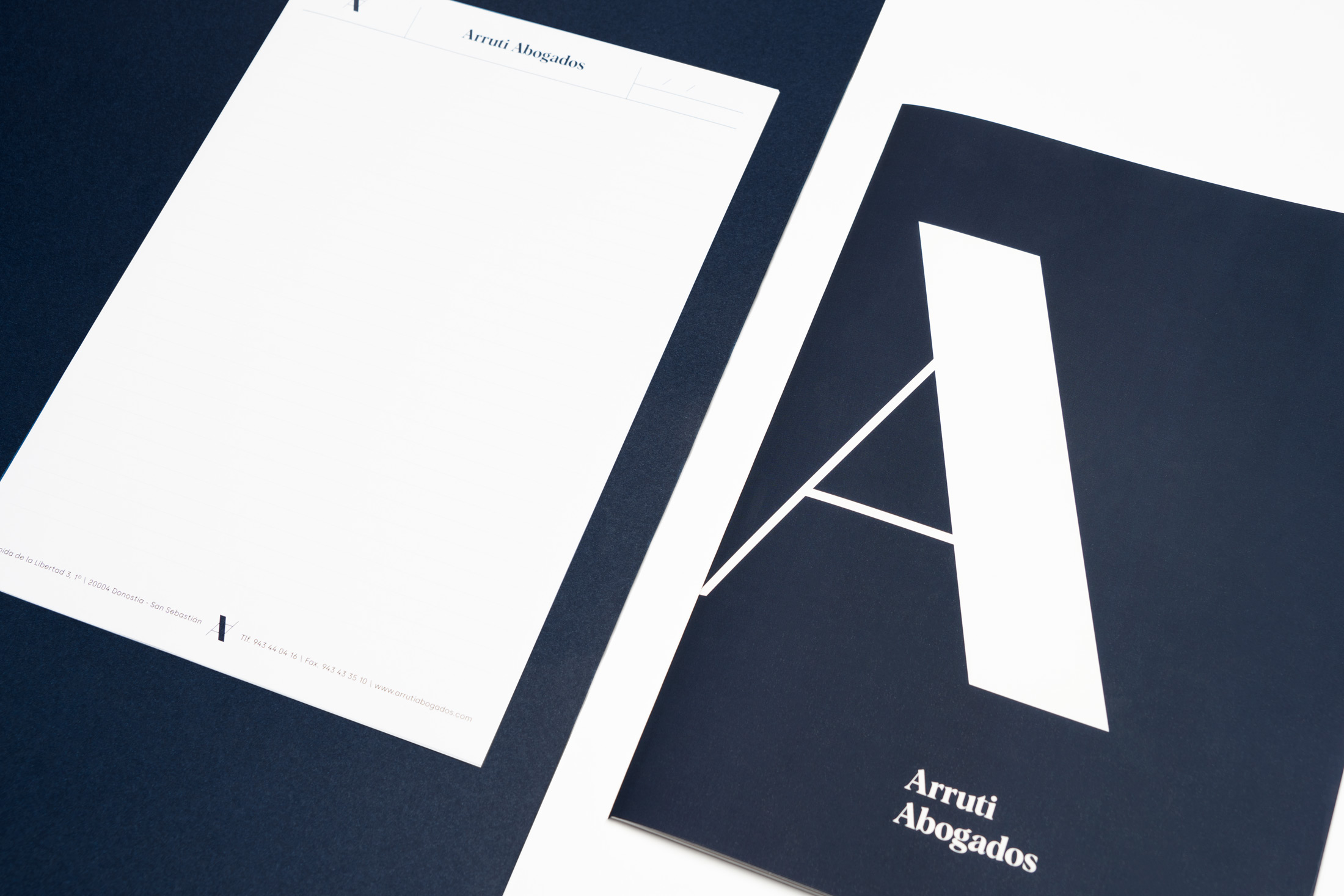 La diagonal es el claro símbolo identificador que ha representado al despacho de Donostia – San Sebastián hasta el momento. Partiendo de la visión de querer crear un logotipo continuista, no solo se ha mantenido sino que se le ha aportado más peso visual. Para ello se ha partido de la inclinación de la propia letra A de Arruti.